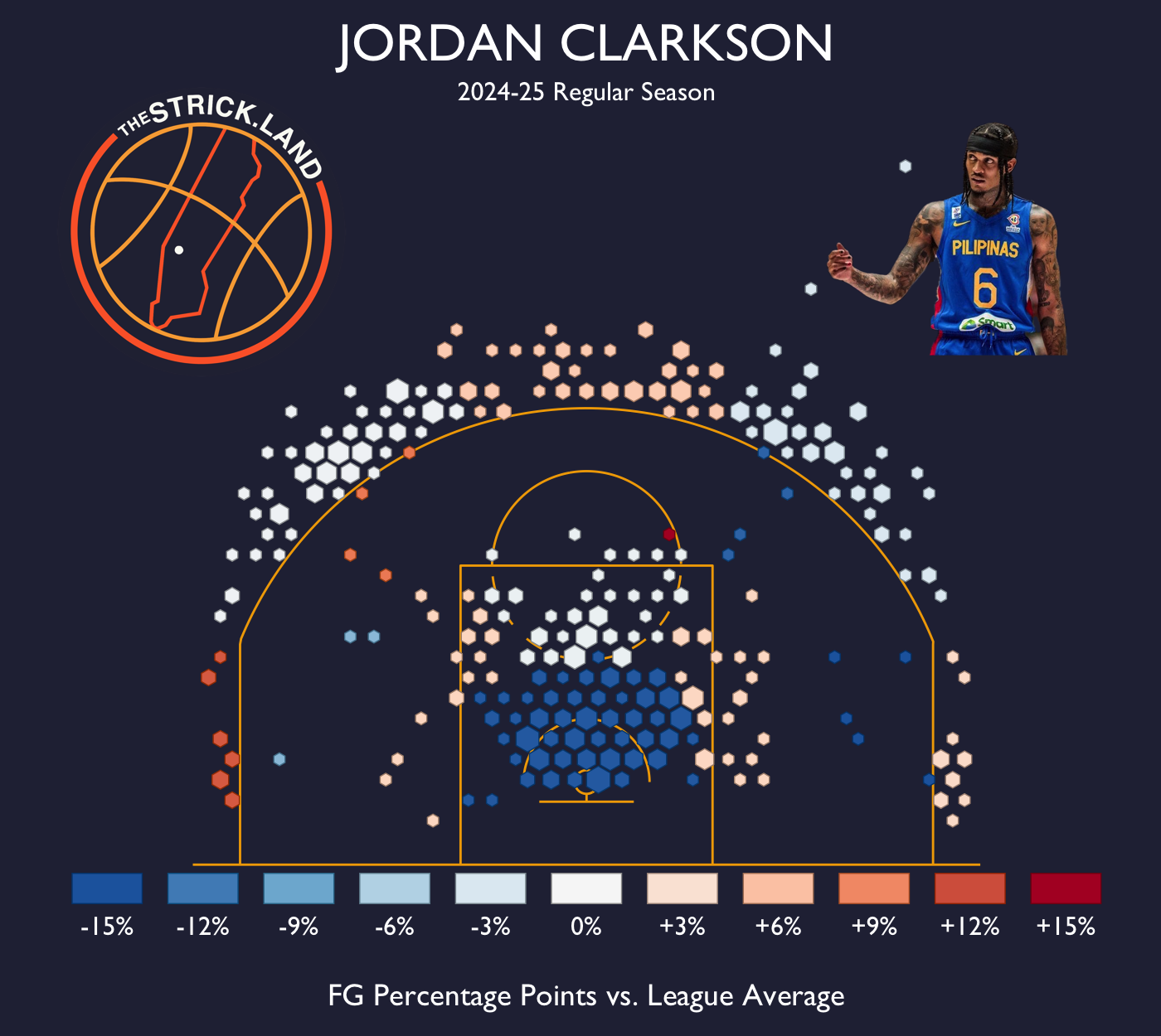 You know the title of this is “Five Graphs?” There’s an assumption that there will be five and only five graphs in this article. Well, like every politician outside of Zohran Mamdani, I lied. There are actually six graphs in this “Five Graphs” article. Because there are two official free agent signings, that means I had to make two shot charts. Here’s Clarkson’s:
