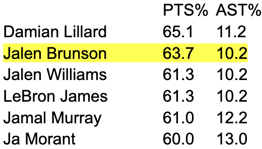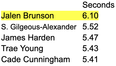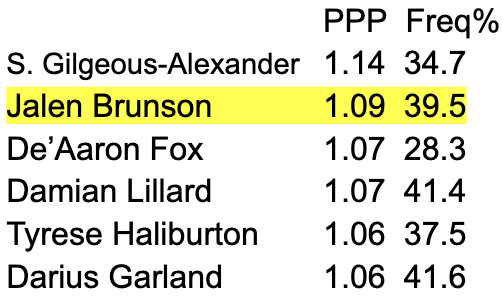 If you’re going to be successful in the isolation game, you probably need to prevail with your pull-up shooting... and Brunson does just that. Among players with at least 300 pull-up shot attempts, he has the fifth-highest FG% (44%), ahead of Shai Gilgeous-Alexander (43.2%).