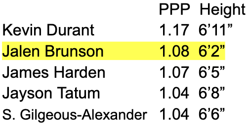 On the season, only Kevin Durant — who has evaded father time on offense in his age-36 season — has posted more points per possession (PPP) in isolation than Brunson among players with 175 isolations. The top-five list for points per possession consists of three guys listed at 6-foot-8 or taller, the 6-foot-5 James Harden, and the “listed” 6-foot-2 Jalen Brunson.
