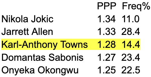 When teams are too busy trying to keep up with Brunson in the pick-and-roll, that opens so much up for fellow All-Star starter Karl-Anthony Towns. He ranks third among players with at least 100 possessions as the PnR roll man with 1.28 points per possession, behind three-time MVP Nikola Jokic and Jarrett Allen — who leads the NBA with a 70% field goal percentage among players with at least 300 field goal attempts.